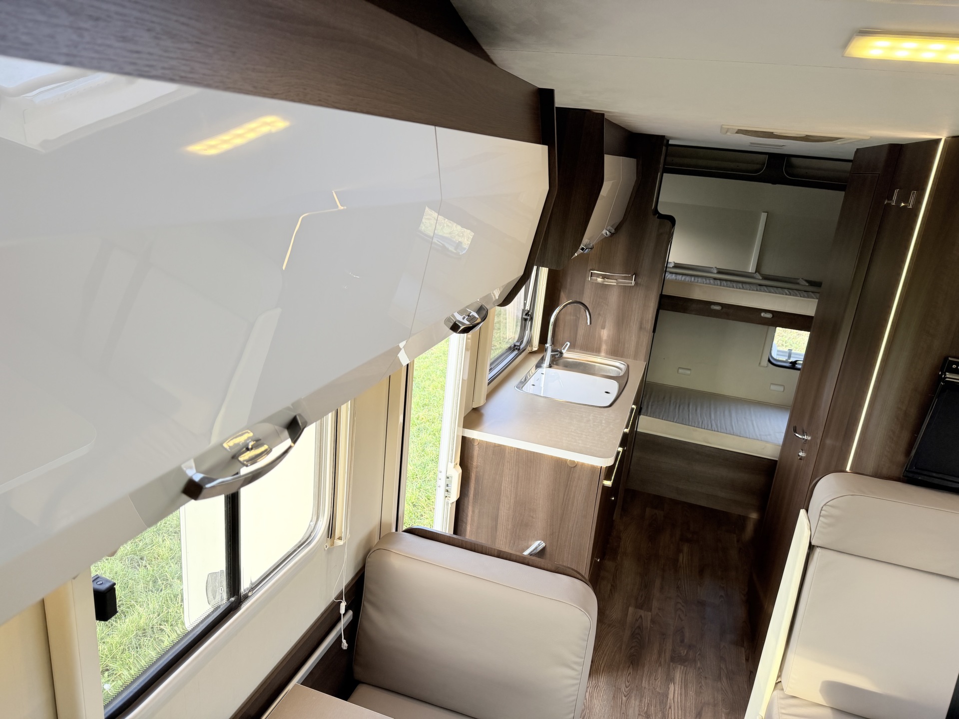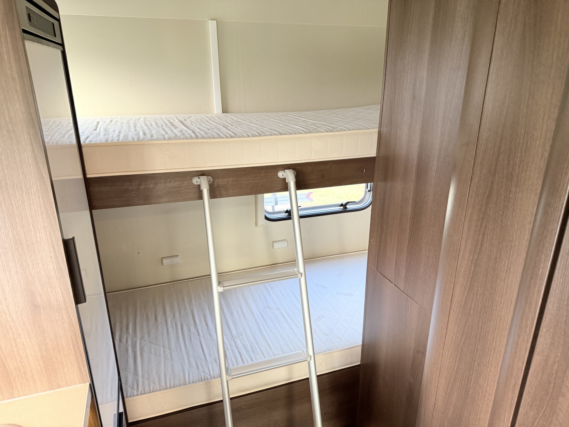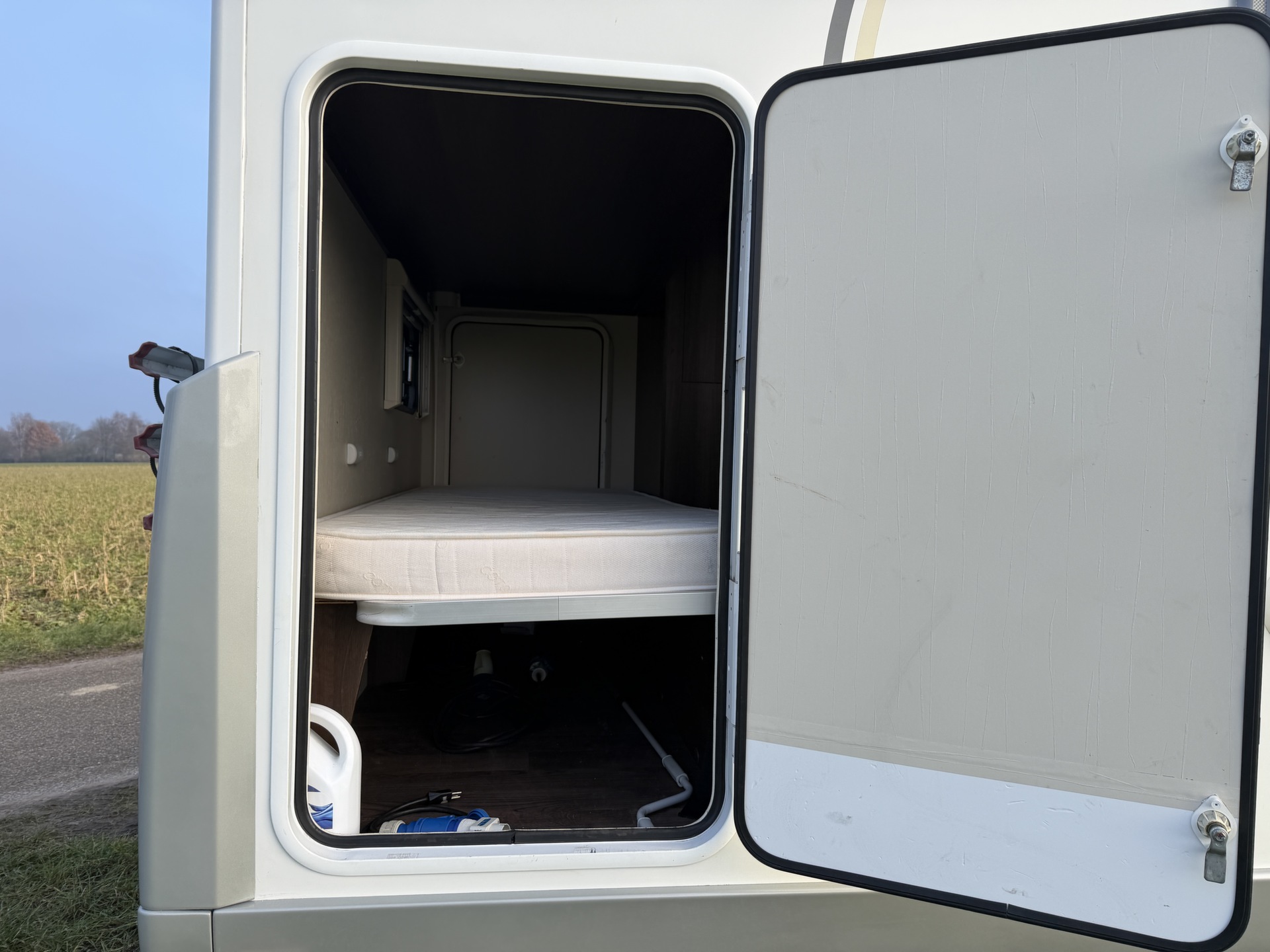 Voorzien van een ruime alkoof, 4 persoons dinette, 2 persoons dinette, keuken, stapelbedden en WC met wasgelegenheid en douche. Het onderste bed is omhoog te klappen zodat een ruime garage ontstaat.