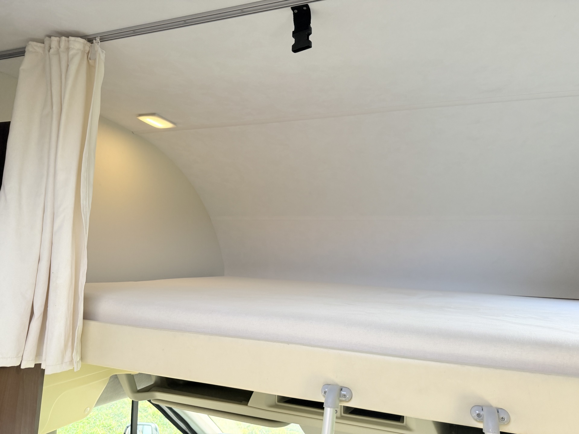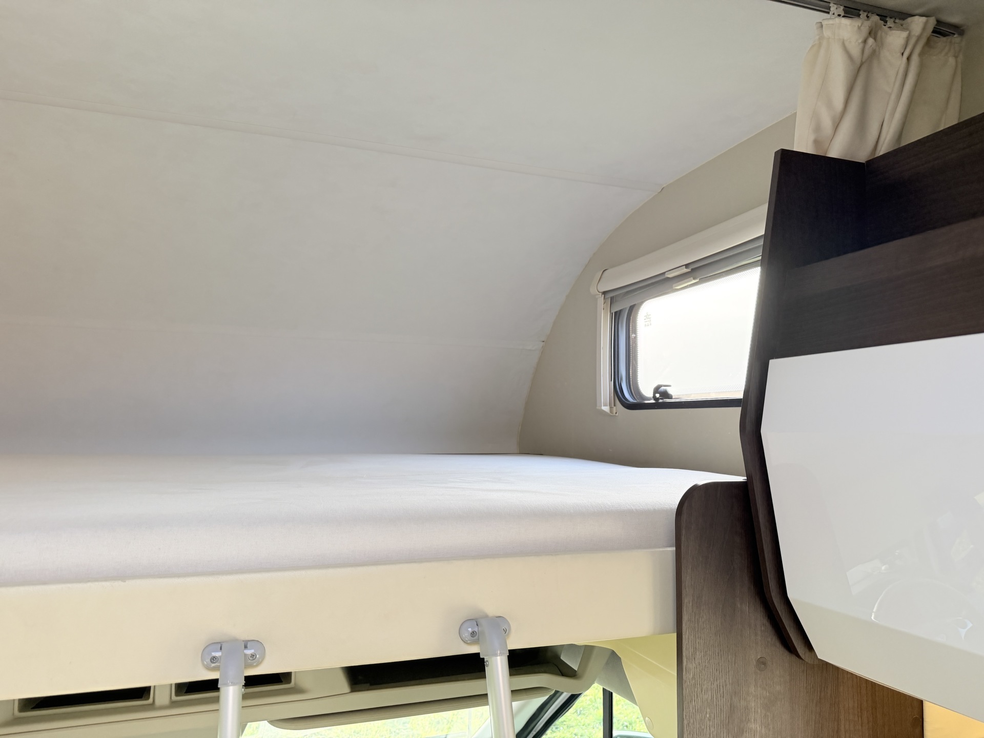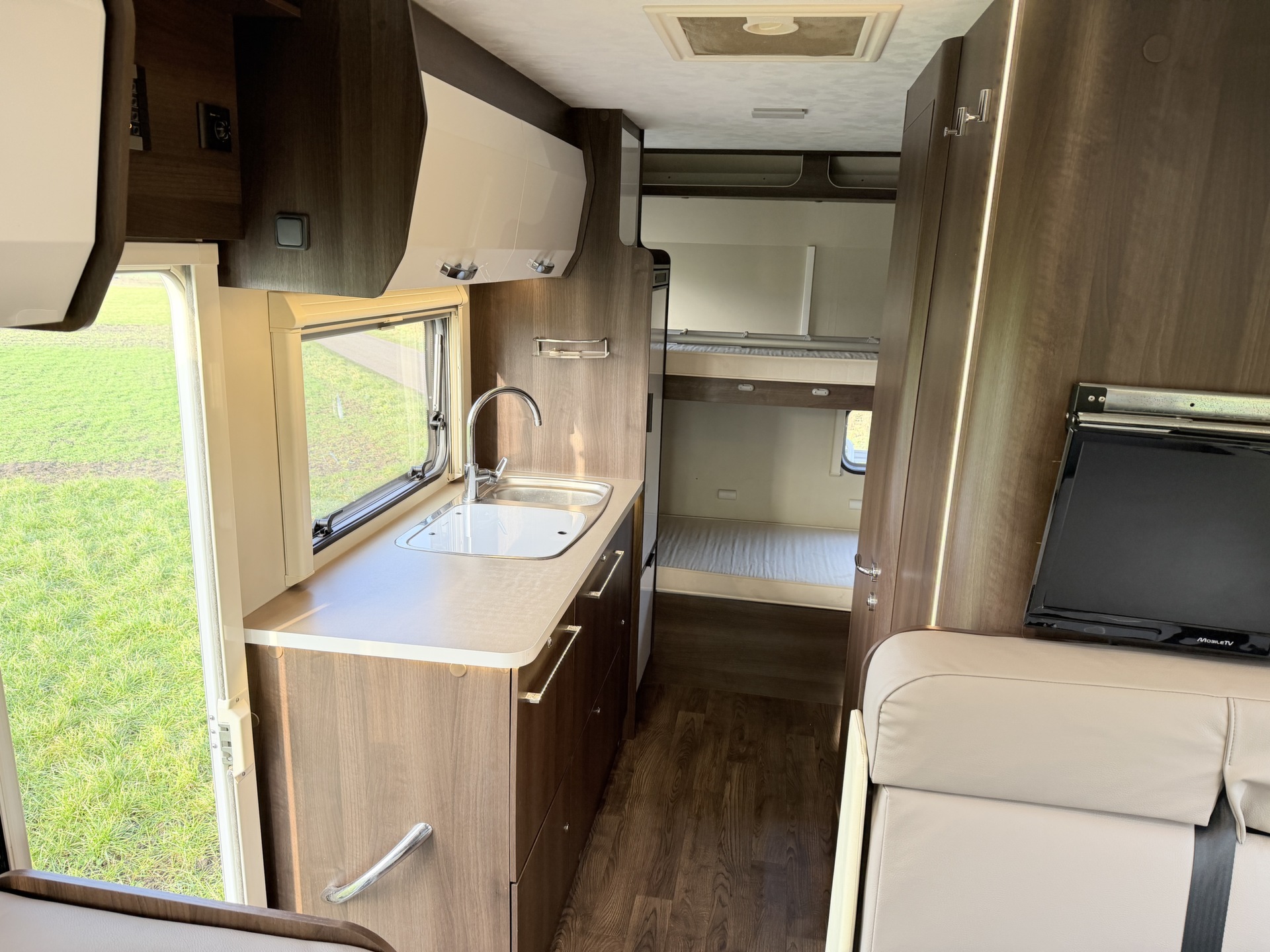 Voorzien van een ruime alkoof, 4 persoons dinette, 2 persoons dinette, keuken, stapelbedden en WC met wasgelegenheid en douche. Het onderste bed is omhoog te klappen zodat een ruime garage ontstaat.