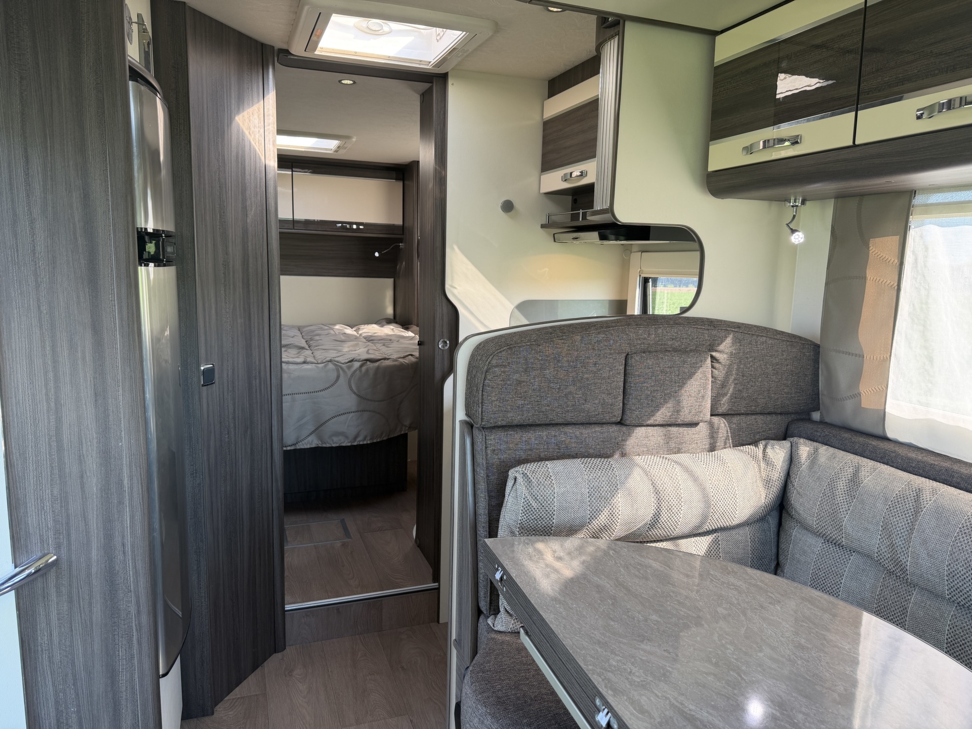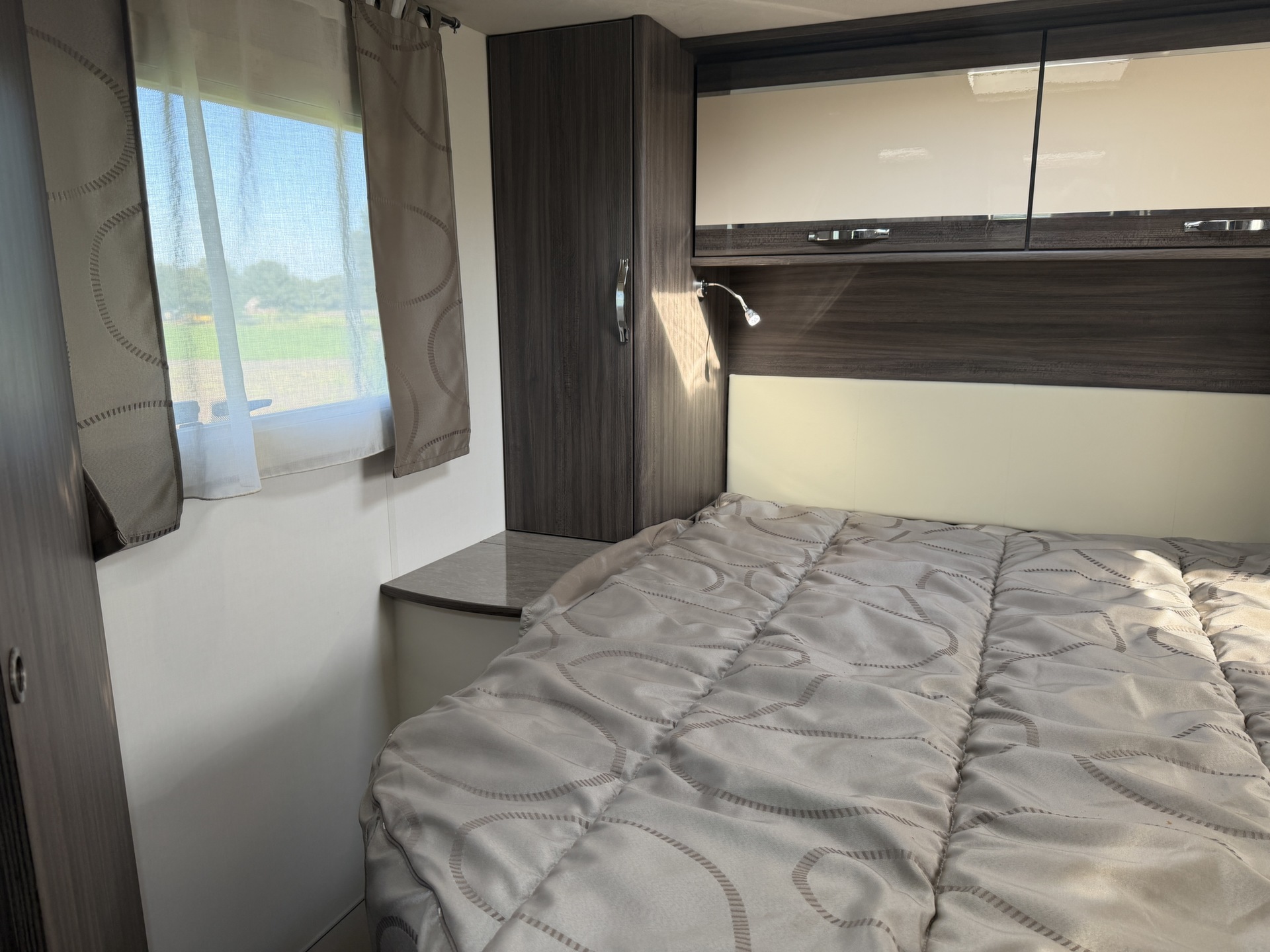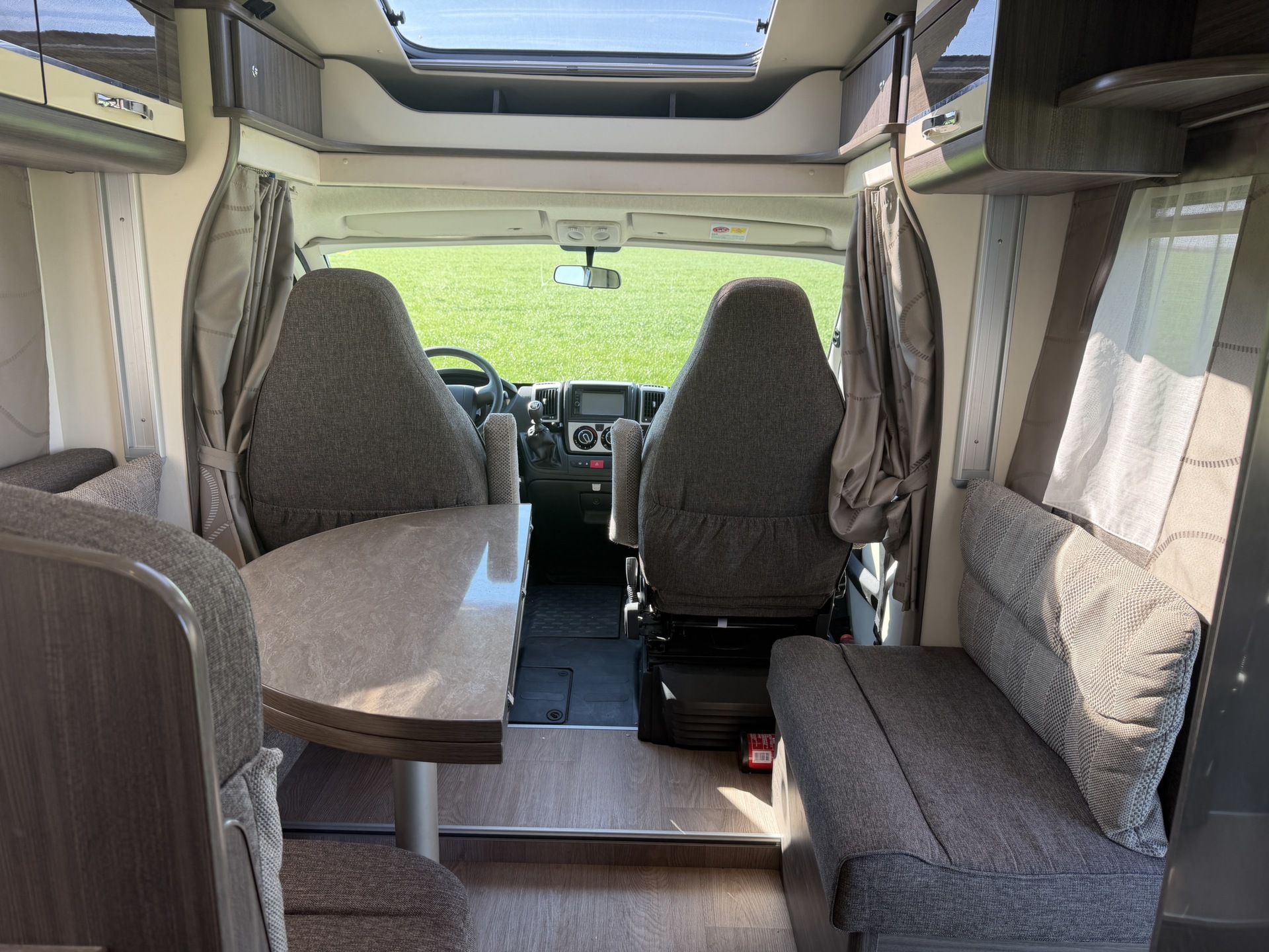 van een queensbed, twee pilotenstoelen die draaien zodat een ruime zit