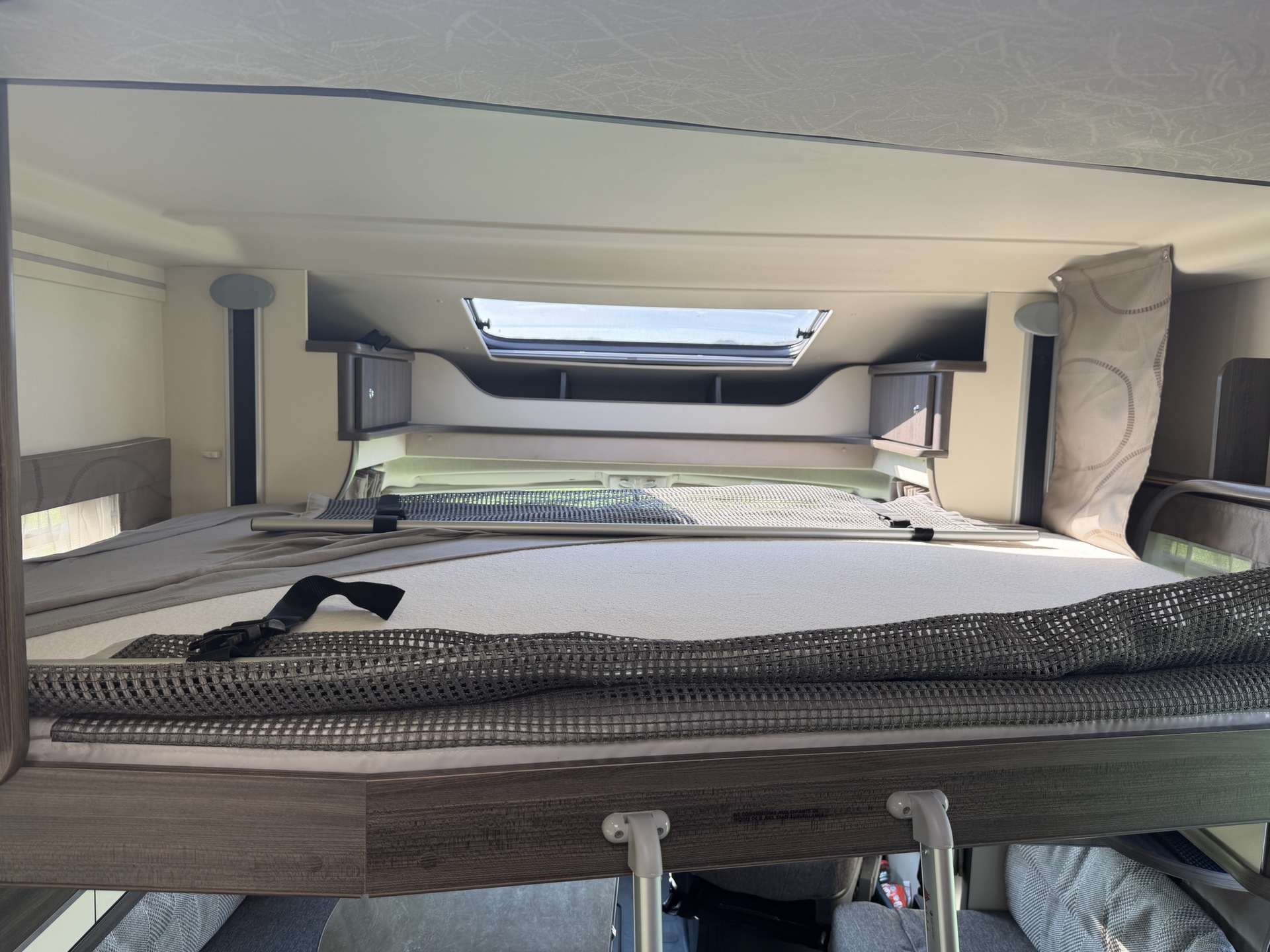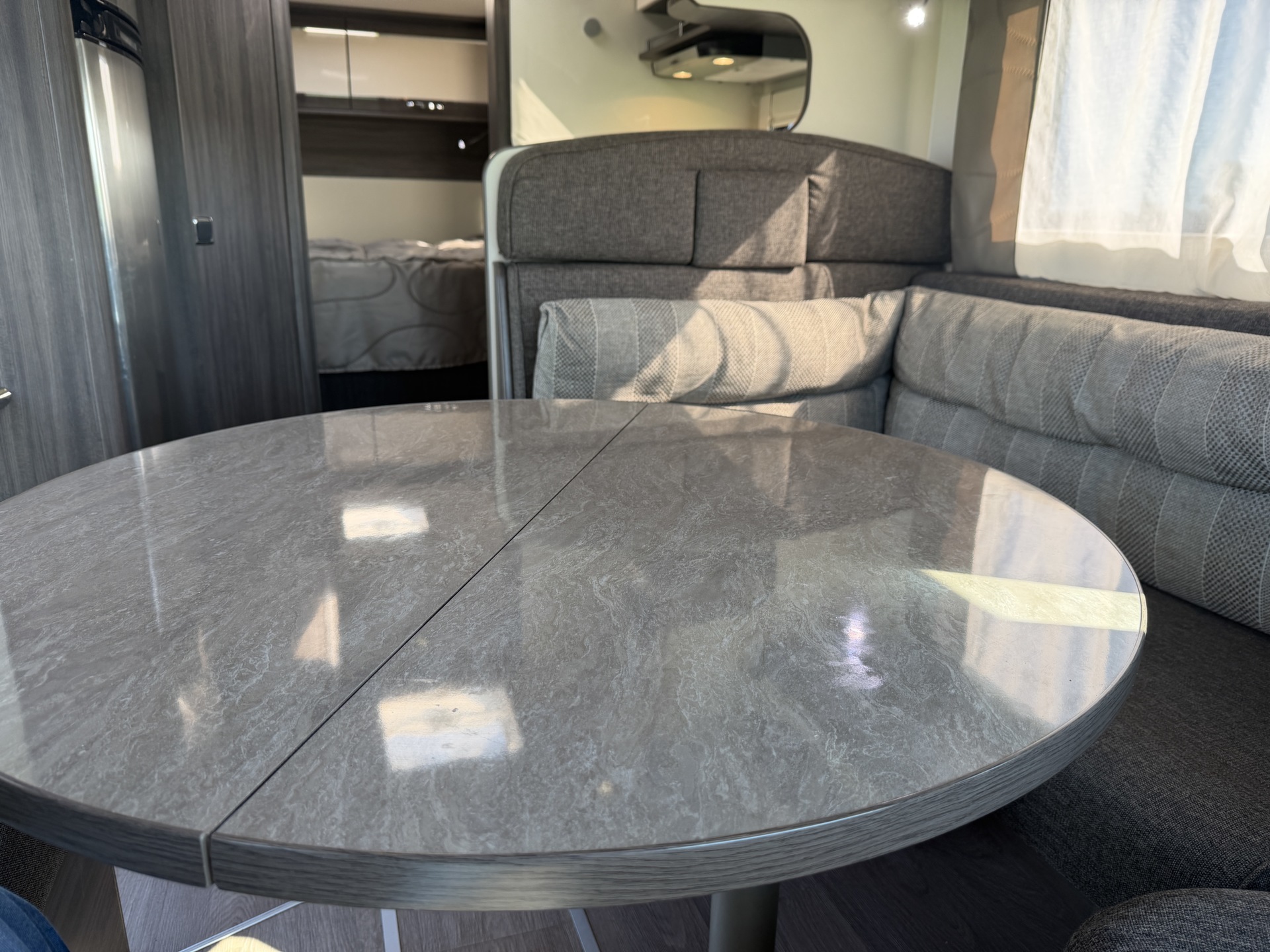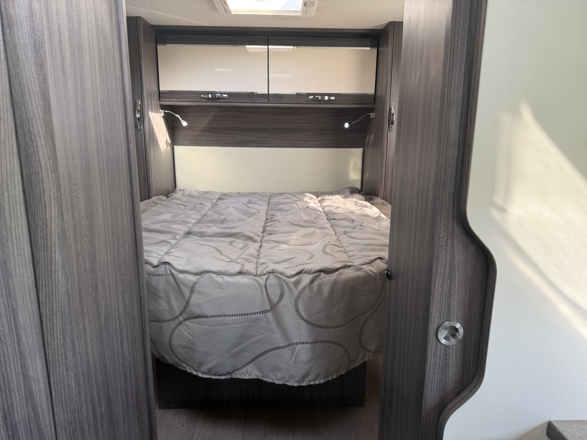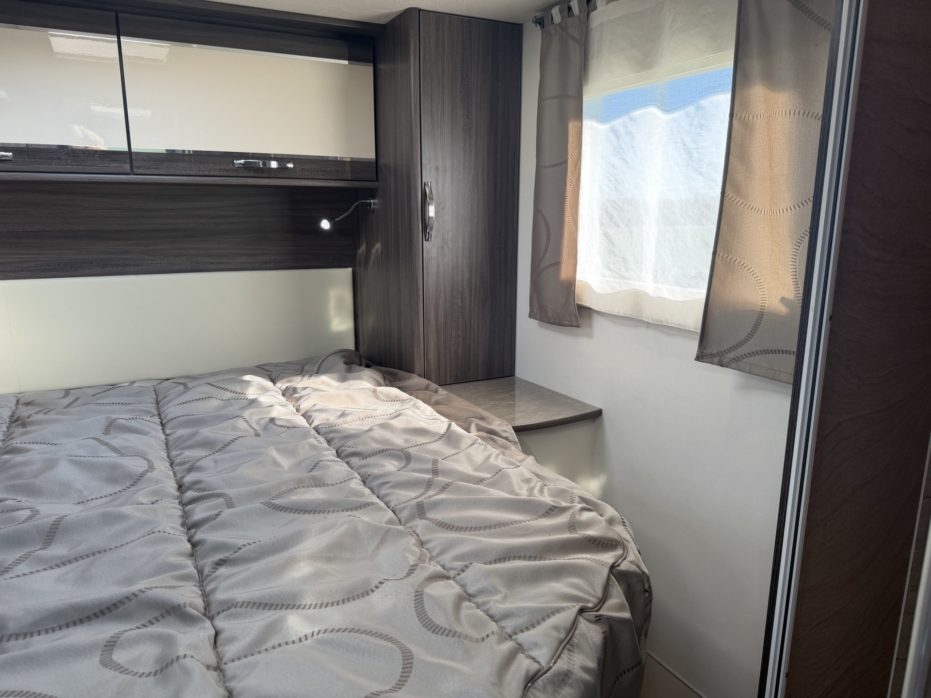 van een queensbed, twee pilotenstoelen die draaien zodat een ruime zit