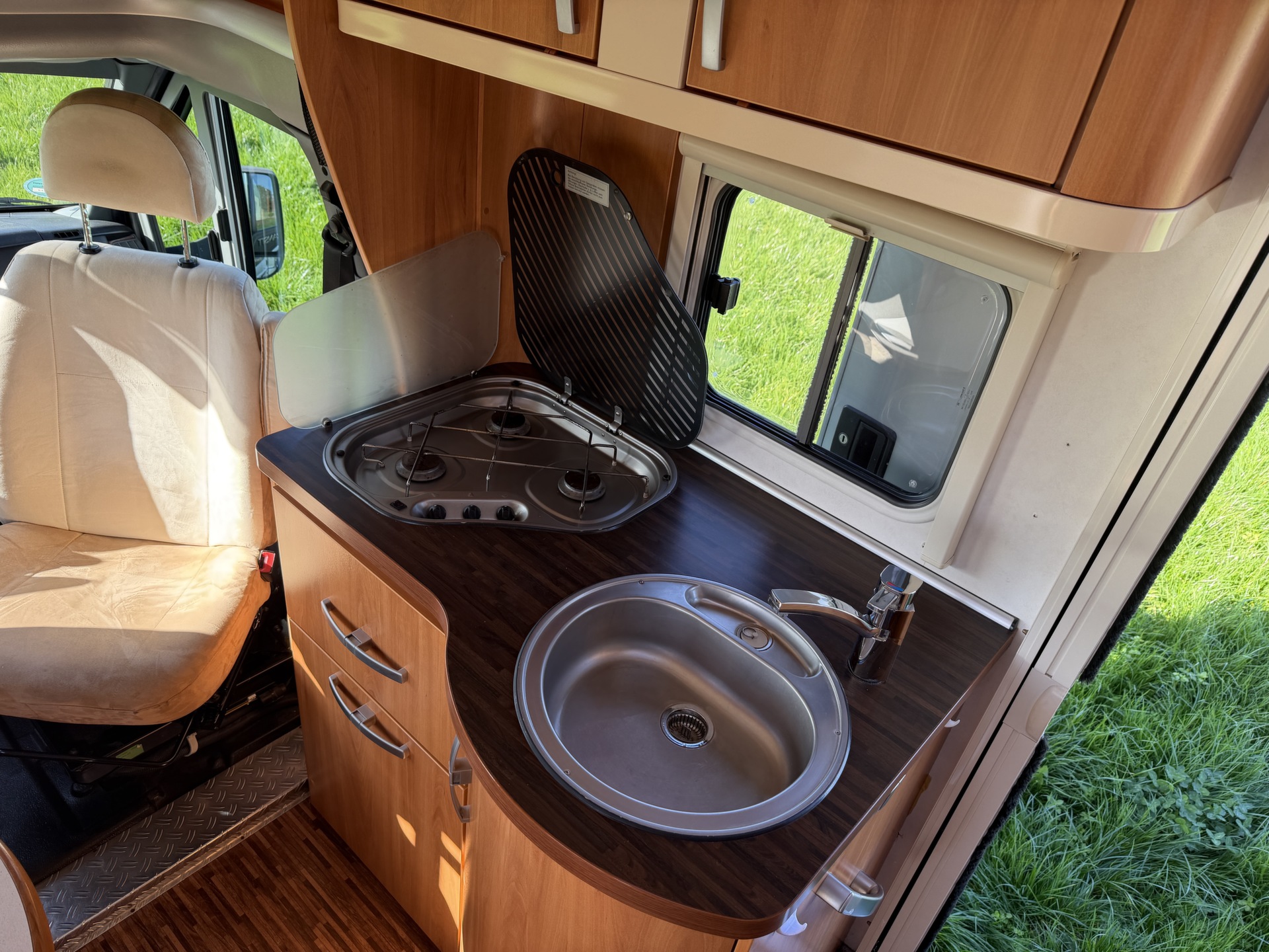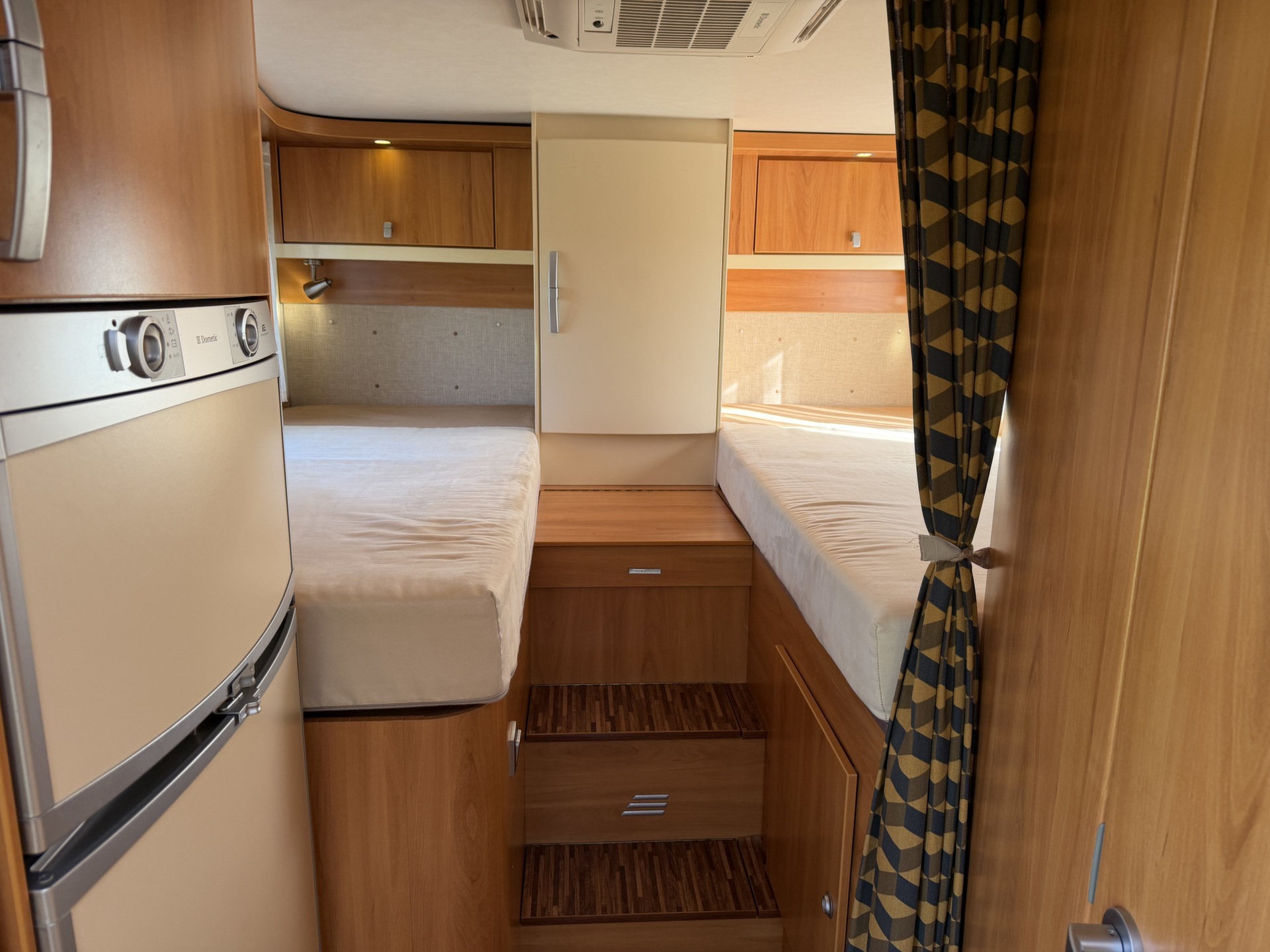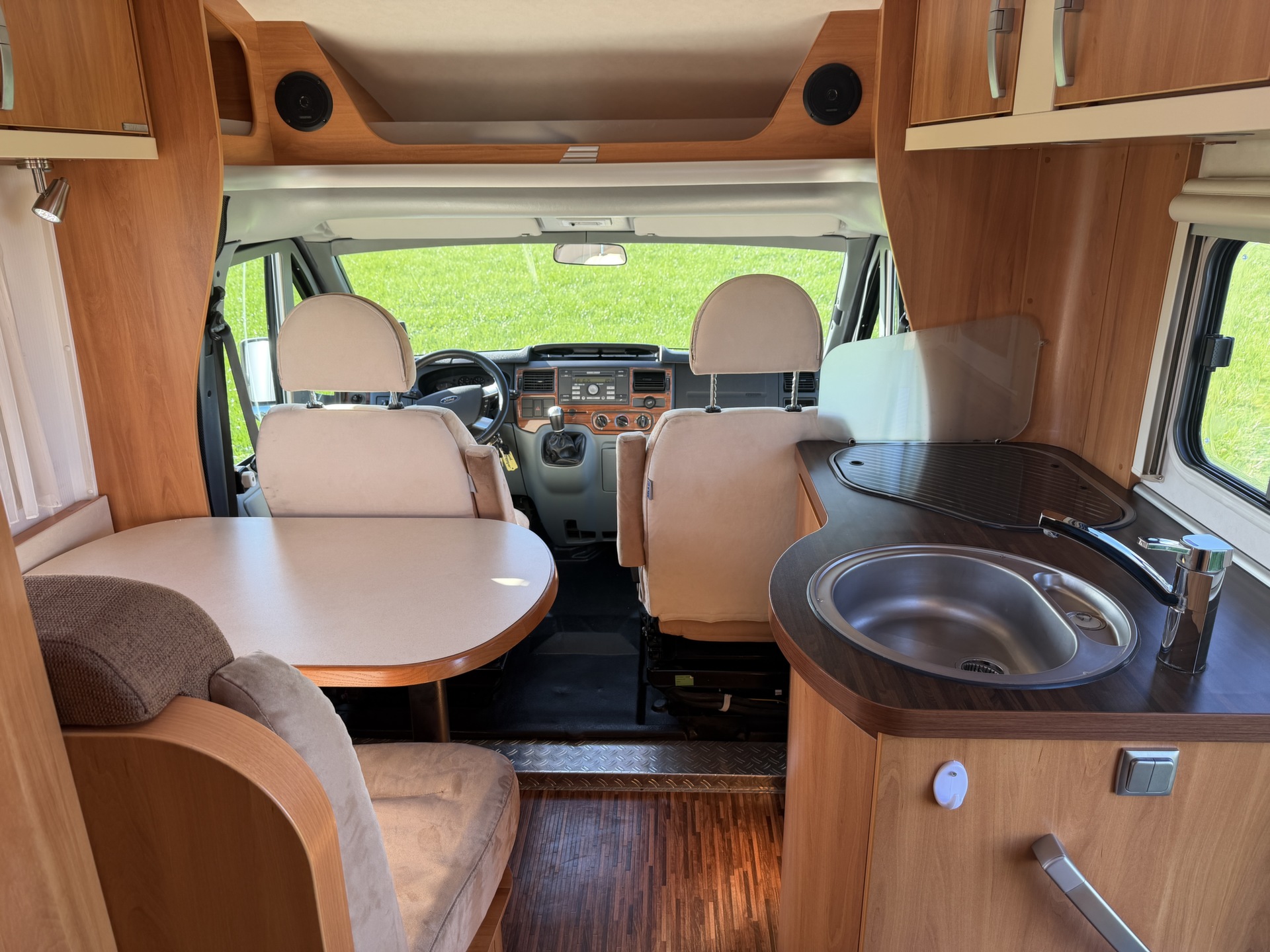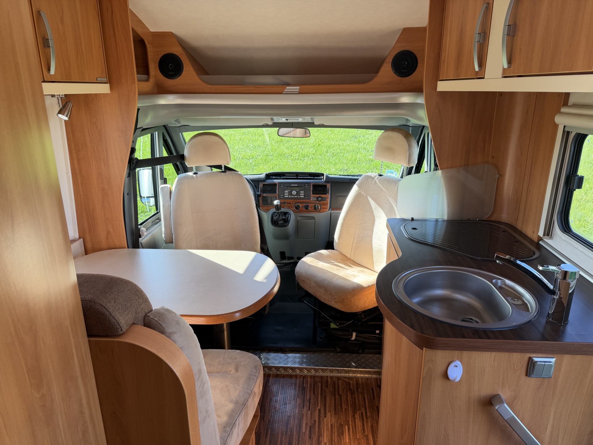van twee lengte bedden, twee pilotenstoelen die draaien zodat een ruime